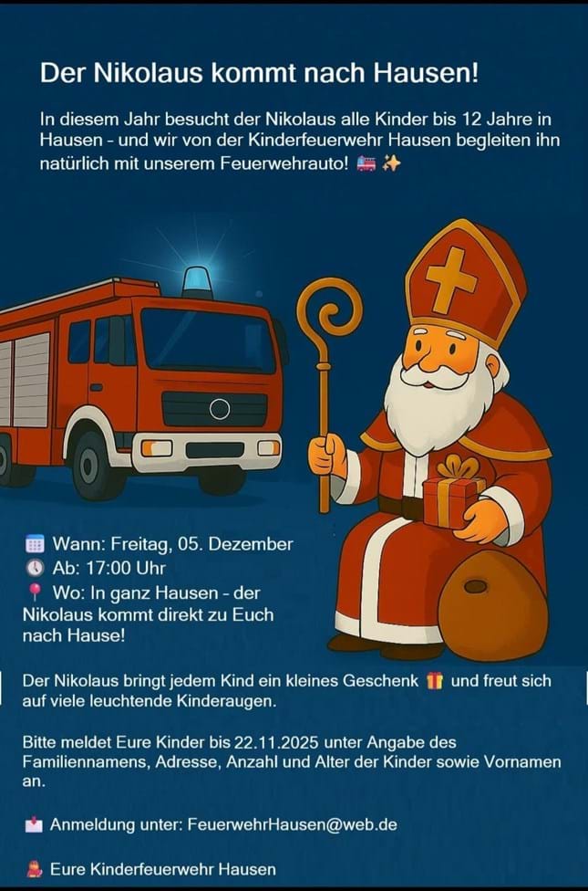In diesem Jahr besucht der Nikolaus alle Kinder bis 12 Jahre in Hausen - und wir von der Kinderfeuerwehr Hausen begleiten ihn natürlich mit unserem Feuerwehrauto ....