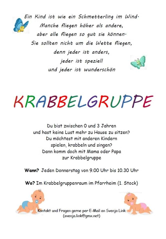 Du bist zwischen 0 und 3 Jahren und hast keine Lust mehr zu Hause zu sitzen? Du möchtest mit anderen Kindern spielen, krabbeln und singen? Dann komm doch mit Mama oder Papa zur Krabbelgruppe.