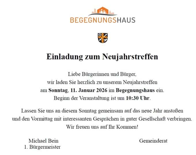 Die Gemeinde Hausen lädt ein zum Neujahrstreffen am Sonntag, 11 Januar 2026 im Begegnungshaus.